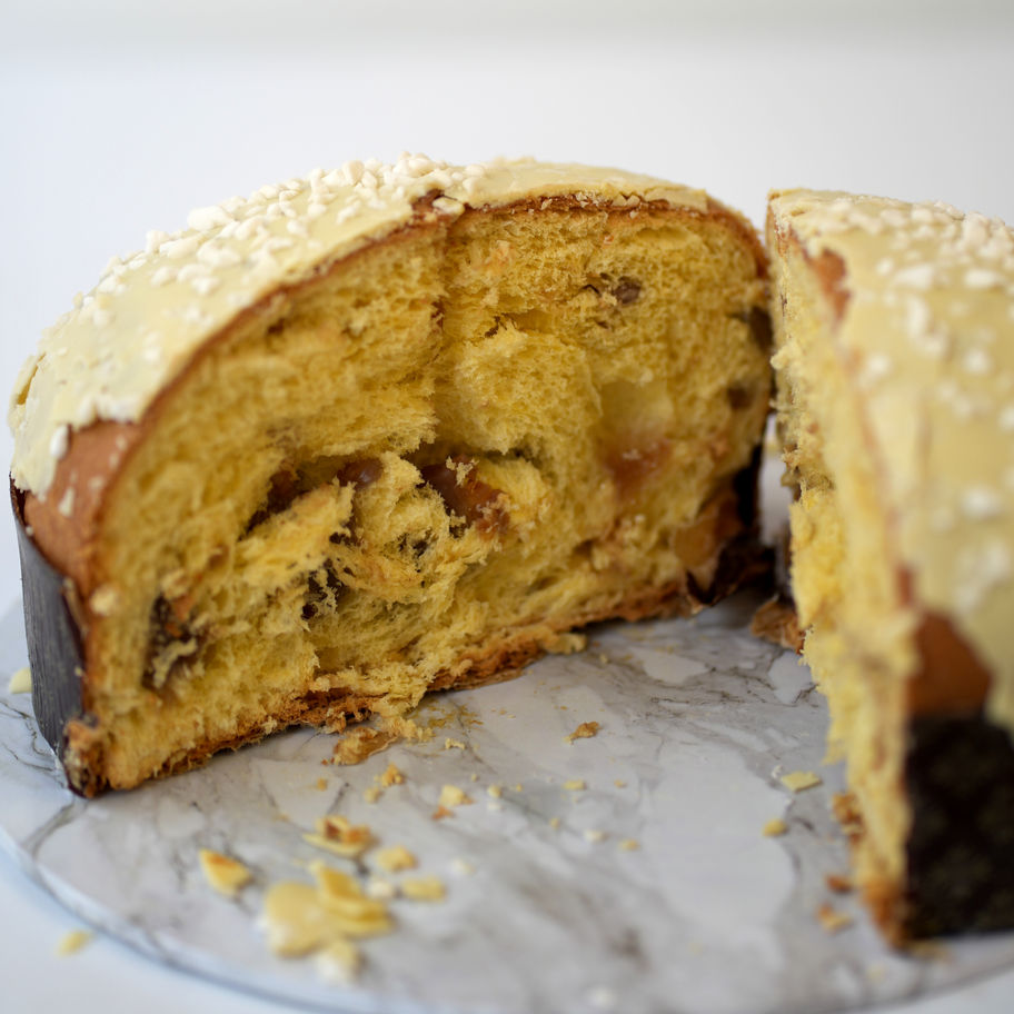 La version la plus emblématique : une pâte légère et alvéolée, longuement levée, parsemée d’agrumes confits (oranges et cédrats) et de raisins sultanines, délicatement parfumée à la vanille naturelle. Le goût du vrai panettone milanais, doux, fruité et réconfortant.